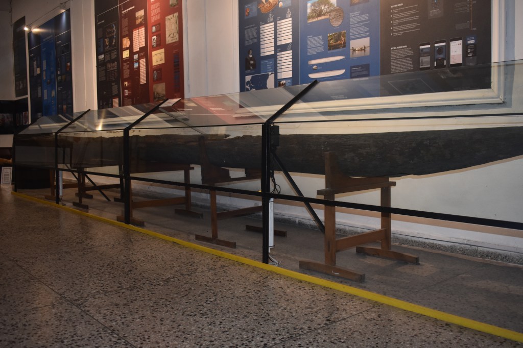 La canoa monóxila trabajada en un tronco de timbó, la que fue encontrada en la Laguna del Diario. Localizada en cercanías de la Base Aeronaval “CC Carlos Curbelo”, quedó en custodia en dicha Unidad hasta que se trasladó al Museo. Es de hacer notar que es una pieza única, y ha sido estudiada por historiadores y antropólogos, existiendo gran preocupación por su conservación, la cual requiere el permanente monitoreo de su estado, tomando en cuenta la humedad, luz y calor, así como el posible ataque de insectos.